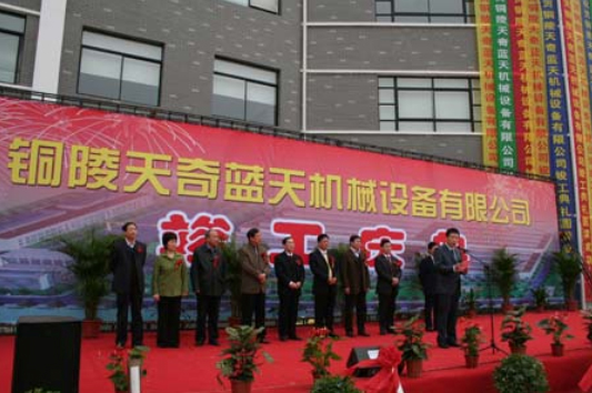 2008年3月28日上午9:58分,公司新廠區竣工典禮在經濟開發園區隆重舉行。銅陵市委書記姚玉舟、市委常委副市長鄒震、市委常委市委秘書長李敬明、市人大副主任唐思定、市政協副主席王剛英、銅陵市紀委副書記汪曉蘭、市經濟技術開發區管委會主任張志文、帶式輸送機協會秘書長李群,江蘇南方天奇集團公司董事長、江蘇天奇物流系統工程股份有限公司創始人黃偉興先生,江蘇天奇物流系統工程股份有限公司總經理、銅陵天奇藍天機械設備有限公司董事長楊雷等相關領導出席了竣工典禮。出席2007年度天奇股份先進表彰大會代表們、供應商、客戶代表以及社會各界友人近200人參加了大會。典禮儀式由銅陵天奇藍天機械設備有限公司總經理汪國春主持。